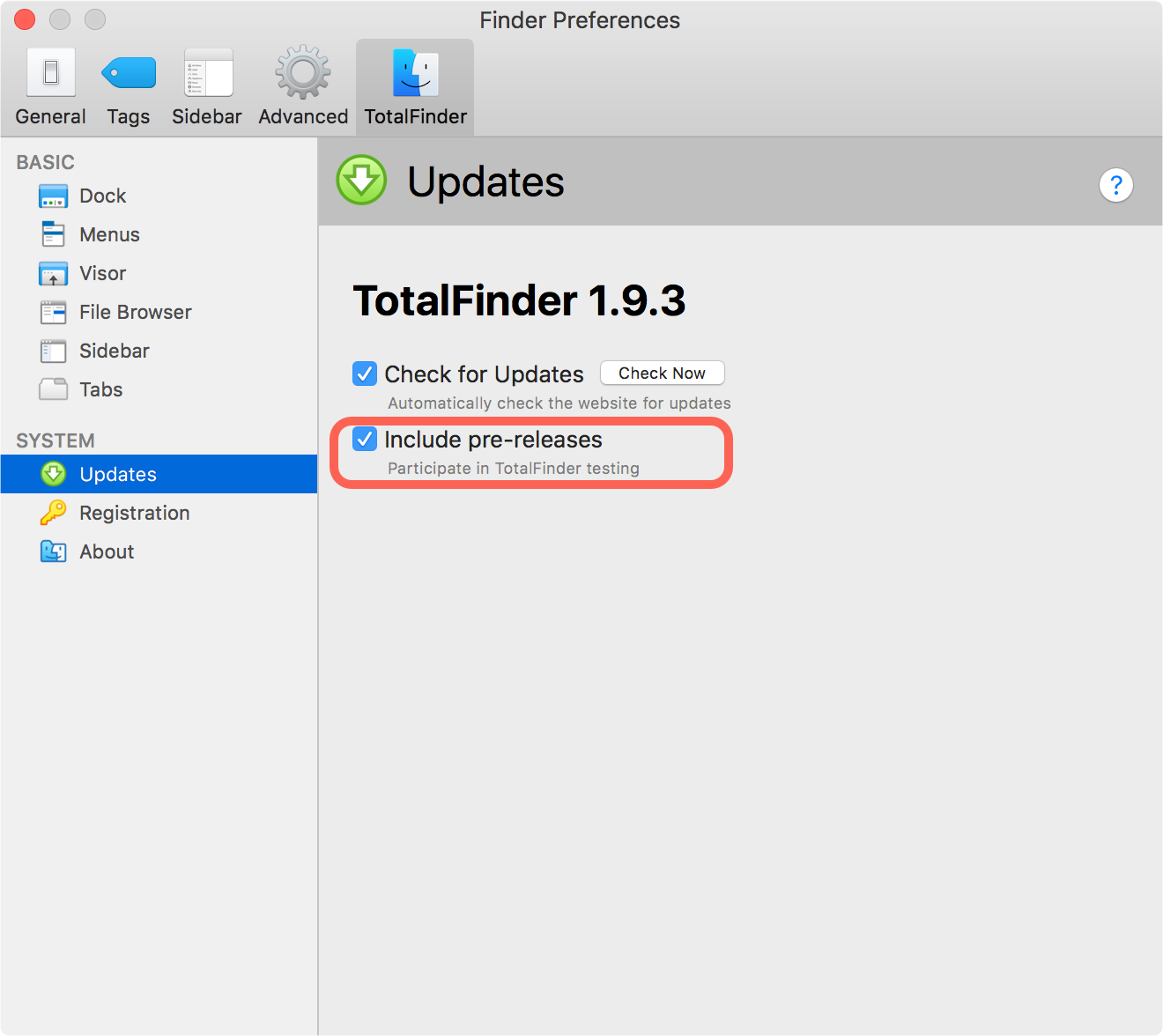 Simply enable the "Include pre-releases" option in the System → Updates section of the TotalFinder preferences tab, as shown below.