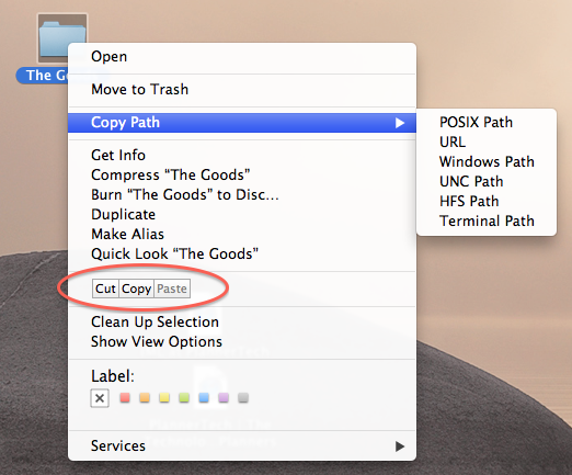 Although you can always use the keyboard shortcuts to cut, copy, or paste an object with TotalFinder installed, this menu option offers a button for each edit operation in the contextual menu.