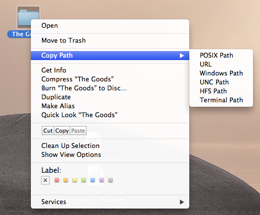 TotalFinder makes it really easy to capture a variety of path formats for a selected object. Right-click on any file or folder, select Copy Path, and select the path format you’d like copied to the clipboard: