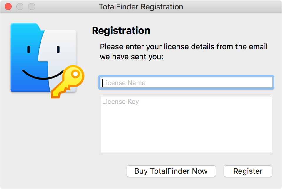 Alternatively you can go through TotalFinder Preferences / Registration / Register button: